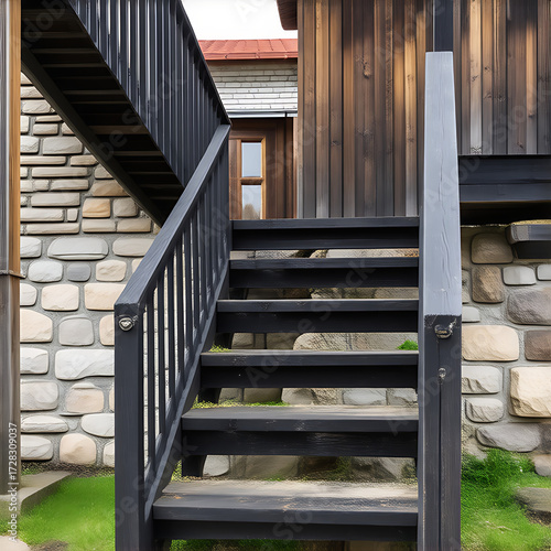 Rustic Wooden Staircase Leading to a Stone and Wood Exterior Entrance of a Cabin