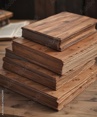 Rustic wooden table displays three book cover mockups; different sizes, close-up view, brown, antique