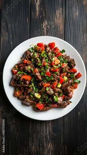 Rustic wooden table hosts a steaming plate of beef and vegetable salad