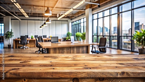 Rustic Wooden Table In A Modern Office Space With Large Windows And Plants.