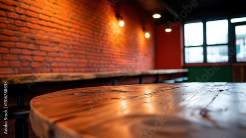 Rustic Wooden Table in Modern Bar Brick Wall Background