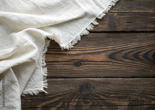 Rustic wooden table surface with a frayed linen napkin draped artfully across the top corner