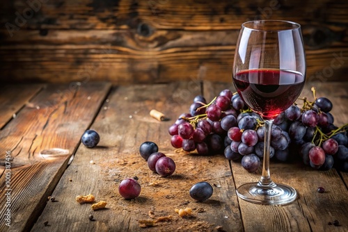 Rustic wooden table with glass of red wine, grapes, crumbs, and wine stains