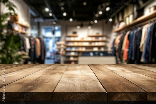 Rustic Wooden Tabletop Mockup: Blank Space, Blurred Closet Background. Perfect for product displays, branding, and lifestyle photography. Showcase