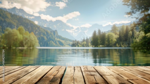 Rustic wooden veranda with lake view. A blurred background with green valleys and forest. The concept of nature and outdoor activities.