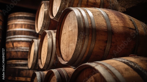 Rustic Wooden Wine Barrels Stacked in Underground Cellar Setting