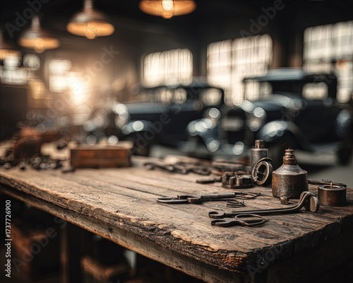 Rustic Wooden Workshop Table With Antique Tools And Vintage Cars