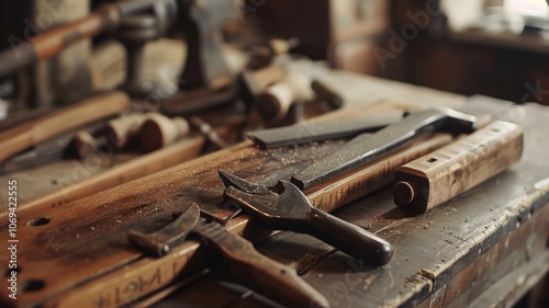 Rustic workshop scene with vintage woodworking tools on weathered workbench