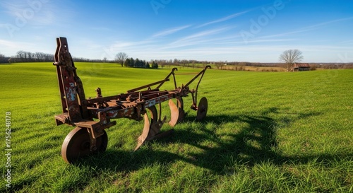 Rusty antique farm plow rests in a vibrant green field under a bright blue sky