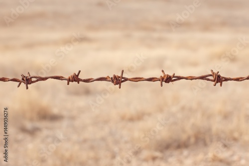 Rusty Barbed Wire Fence Detail on Blurred Beige Background: Country, Ranch, Boundary, Obstacle