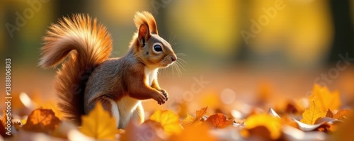 Rusty brown squirrel amidst vibrant autumn leaves in a Czech park , woodland, Bohemian