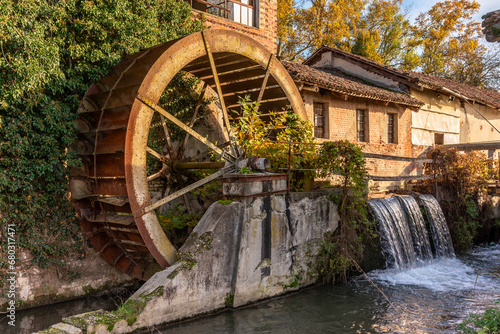 Rusty disused mill paddle wheel near canal in Italian Po Valley