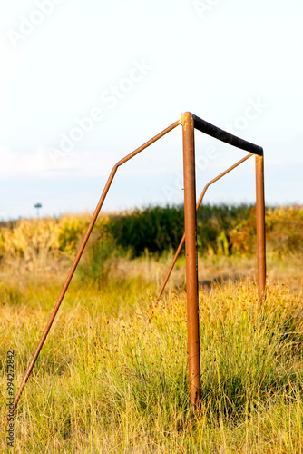 rusty football goal on forgotten soccer field in a village in Leon, Spain