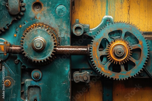 Rusty gears interlock, showcasing intricate machinery and vintage industrial design.