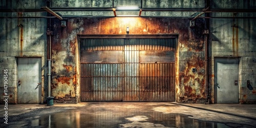 Rusty Industrial Building Entrance with Metal Doors and Lighting