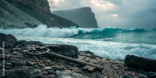 Rusty Key on Rocky Seashore with Dramatic Waves Crashing Against Cliffs