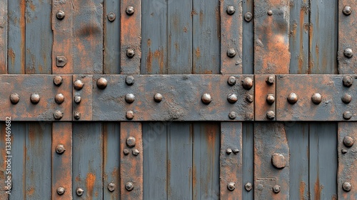 Rusty metal door with rivets industrial setting close-up view textured background grunge aesthetic