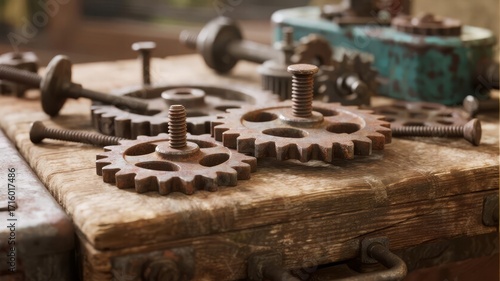 Rusty Metal Gears and Bolts Scattered on Wooden Workbench, Symbolizing Mechanical Wear, Repair, and Vintage Machinery Concepts