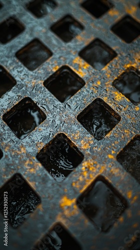 Rusty Metal Grate with Water Reflection and Textured Surface Detail