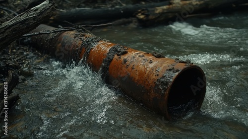 Rusty Metal Pipe Lying in Water with Flowing Stream and Natural Debris Around It