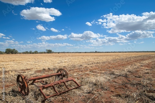 rusty old farming equipment sits abandoned in a vast field, under a bright blue sky with fluffy clouds