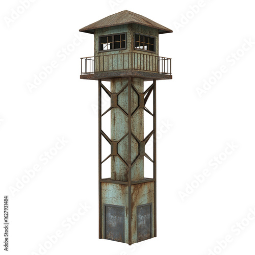Rusty Old Watchtower with Staircase and Observation Deck isolated on transparent white background, clipping path