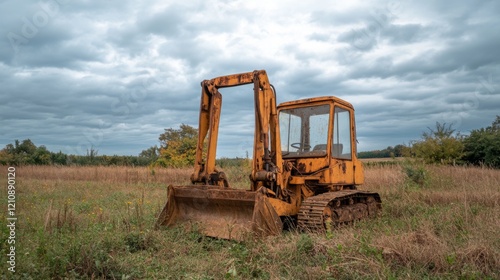 Rusty orange excavator sits abandoned in a field under a cloudy sky.