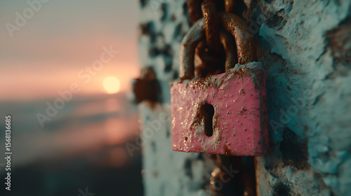 Rusty Padlock Romance: Macro Detail of Weathered Metal Security at Sunset Over Ocean Twilight