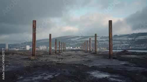 Rusty Pillars on Abandoned Industrial Site Against Cloudy Sky with Urban Landscape in Background