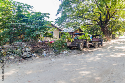 Rusty vehicles on a dusty street in Mandalay, Myanmar