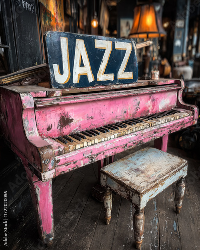 Rustykalne zdjęcie różowego, zniszczonego fortepianu i tabliczki z napisem "JAZZ". Scena stylizowana na klub muzyczny, z nastrojowym światłem. Retro, vintage klimat.