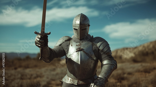 Rycerz w lśniącej zbroi stoi na straży, unosząc miecz ponad głową. Jego błyszczące uzbrojenie i zdecydowany gest świadczą o sile i honorze.