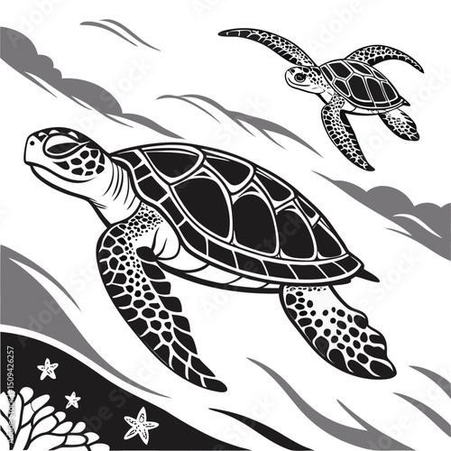 "Sacred Sea Turtle Duo – Tribal Flowing Ocean Vector"