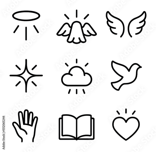Sacred Symbols Icon Set. Outline icon set of divine glow: halo, beams of light, angel wings, shining star, glowing cloud, dove