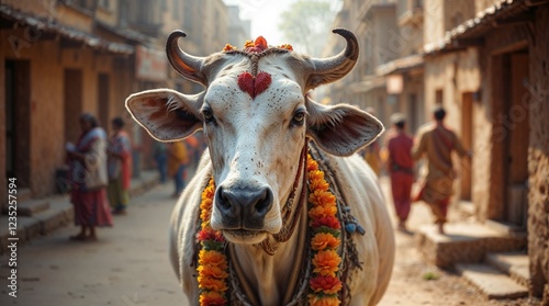 Sacred White Cow Decorated with Colorful Garlands in an Indian Village