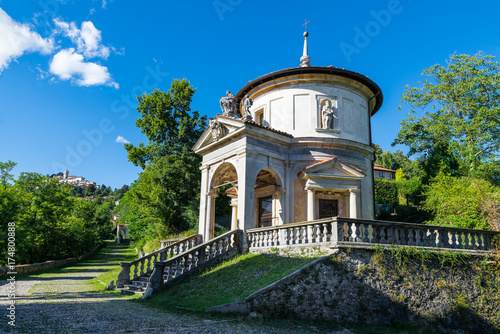 Sacro Monte of Varese (Santa Maria del Monte), Italy. Via Sacra that leads to medieval village, with the seventh chapel. In the background the village of Sacro Monte. World Heritage Site - Unesco