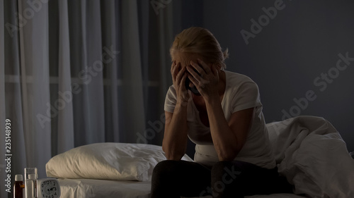 Sad blond lady sitting on bed night, covering face with hands, health disorder