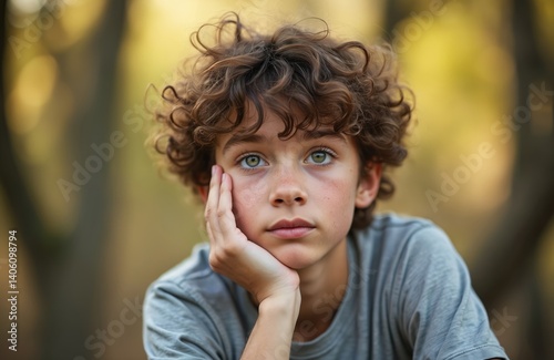 Sad boy with curly hair rests in nature, thinks about future. Upset young man in portrait with headache, frustration. Sad, depressed student with problems, troubles. Close up of photogenic face in