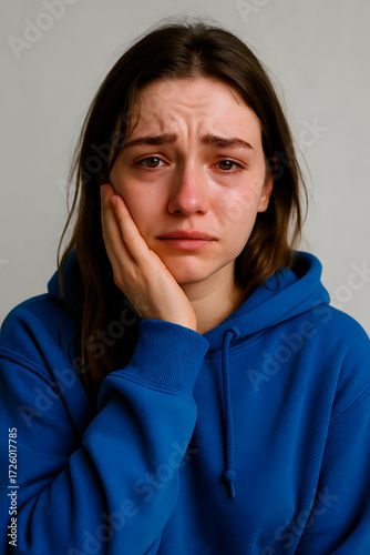 sad brunette girl in blue sweatshirt. realistic photo of grief, depression, nervousness, tragic