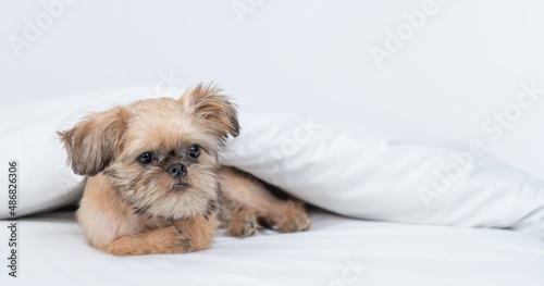Sad Brussels Griffon puppy lying under white warm blanket on a bed at home. Empty space for text