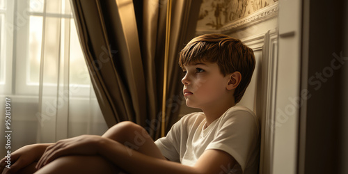 Sad child boy sitting in the corner of the room as punishment for misbehavior
