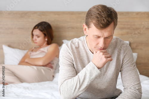 Sad couple after quarrel in bedroom