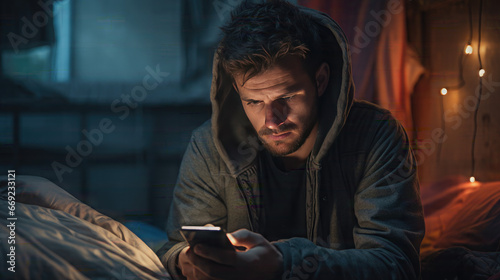 Sad Exhausted Young Man In her Bed Staring At Smartphone Screen, can't Sleep. Life Apathy.