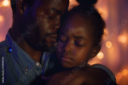 Sad father hugs his cute child daughter. An emotionally touching portrait of hurt and happiness with tears in the eyes.