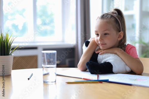 Sad little girl sitting in the table with a toy panda bear while sitting in living room at home.