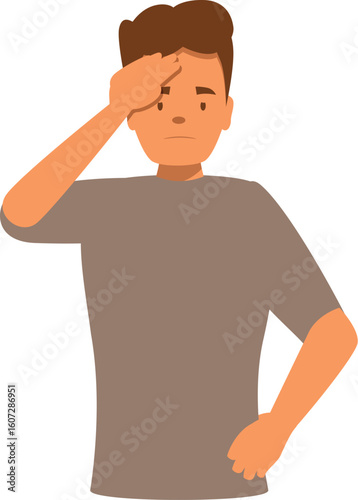Sad man suffering from headache touching his forehead feeling pain, migraine symptom, healthcare concept