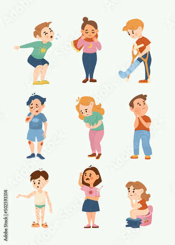 Sad sick boys and girls cartoon illustration set. Kids catching cold, having fever, nausea, flu, toothache or headache. Little children feeling unwell, breaking leg. Disease, health concept