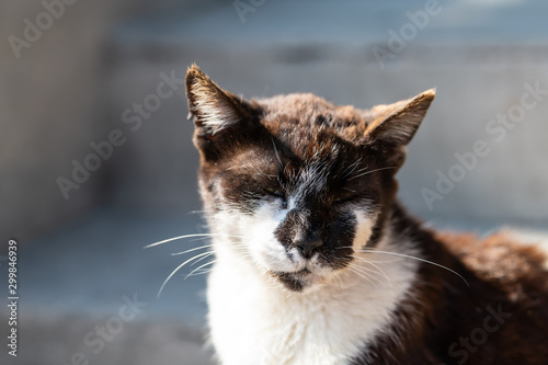 Sad sleep stray black and white cat on porch steps of street in New Orleans, Louisiana with closeup of face and closed eyes