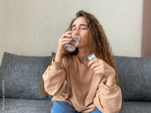 Sad, upset, young woman holding a glass of water and pills sitting in the living room, feeling ill.