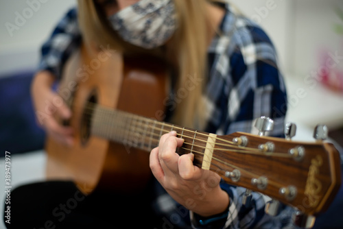 sad woman locked home during lockdown in quarantine playing quitar with face mask and cannot sing due to restriction covid-19